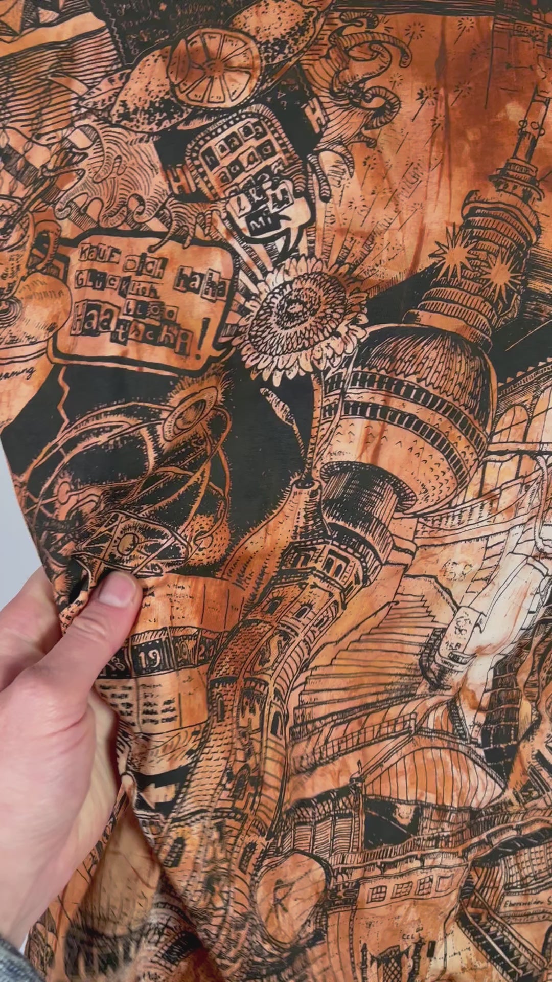 Ce t-shirt unique allie des matières de haute qualité à l'énergie brute et authentique de l'artisanat berlinois. Chaque pièce est teinte à la main selon une technique spéciale inspirée de la rouille, capturant la patine naturelle et le caractère vieilli rappelant l'oxydation du fer. Sérigraphié et réalisé par l'artiste, il est confectionné sur des vêtements Stanley & Stella durables et certifiés Commerce équitable, composés à 85 % de coton biologique et à 15 % de polyester recyclé. Plus qu'une simple mode équitable, c'est une œuvre d'art à porter, imprégnée du passage du temps et des histoires d'une ville en mouvement.