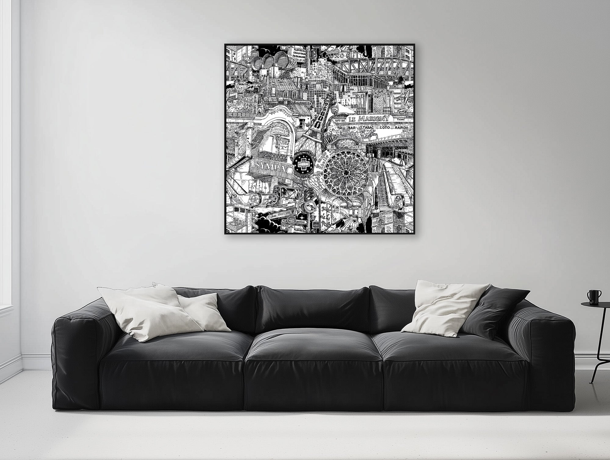 Celebrate the artistic heart of Switzerland with this hand-drawn canvas print of Basel. Heiner's detailed black and white sketch captures the city's iconic architecture, vibrant atmosphere, and artistic heritage.